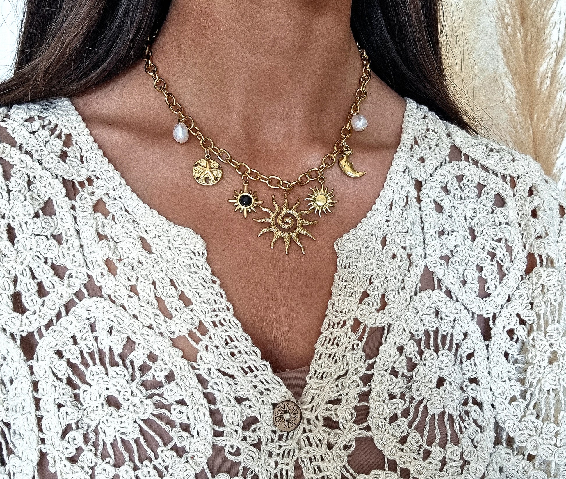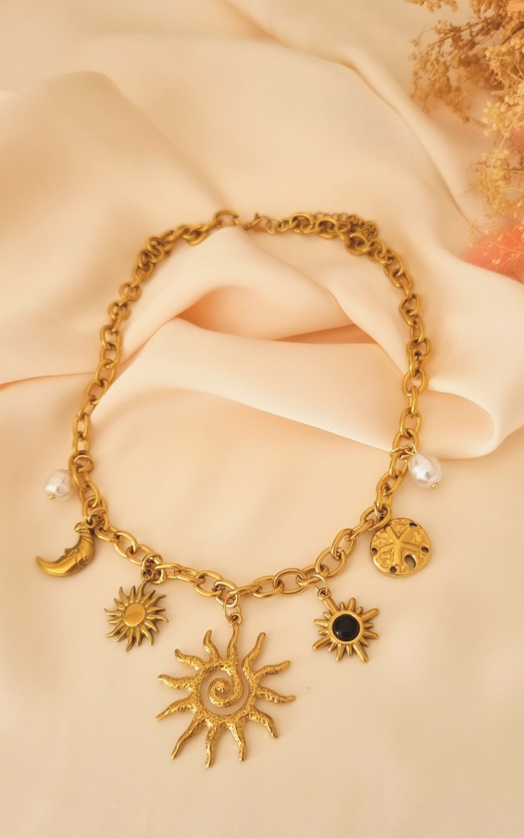Composé de breloques dorées — soleil, lune, perle et médaillons — il évoque un univers magique entre lumière et spiritualité. Sa chaîne généreuse et ses détails texturés lui donnent un caractère fort et captivant.