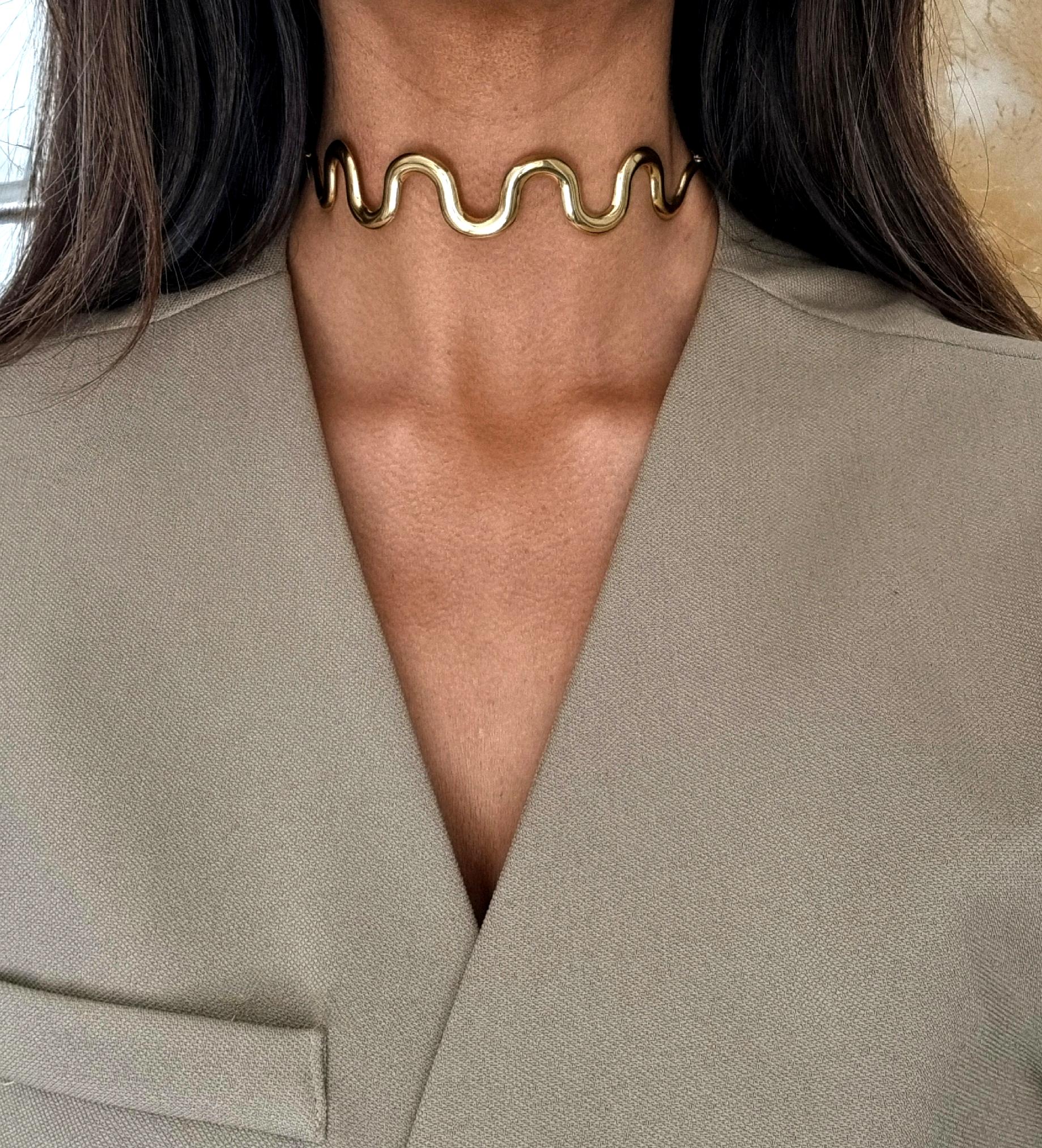 Audacieux, sculptural et hypnotique, le collier Waves embrasse le cou comme une vague figée dans l’or.